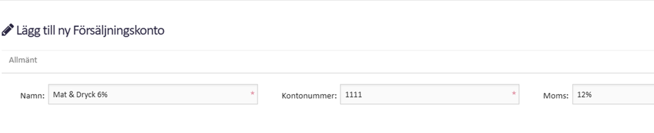 - Skapa ett nytt försäljningskonto, i detta exemplet skapas ett konto med namnet ”Mat och dryck 6%”.