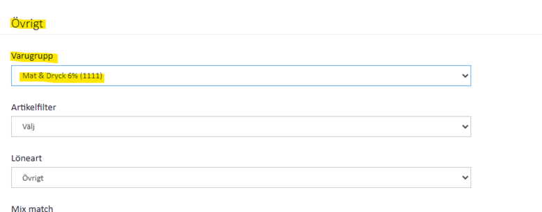 - Klicka på artikelnamnet och scrolla sedan ner till ”Övrigt” och klicka i drop down-listan och välj den varugrupp artikel ska kopplas mot. I detta fall väljs den som skapades ”Mat & Dryck 6%”.