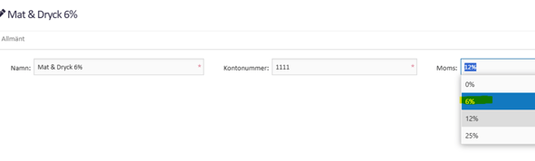 Det man gör är att man går in på det eller de försäljningskonton man skapat och ändrar momsen från 12% till 6% och trycker på ”Spara” så ska artiklarna hinna ändras innan 1 april. Kassorna ska inte behövas startas om.